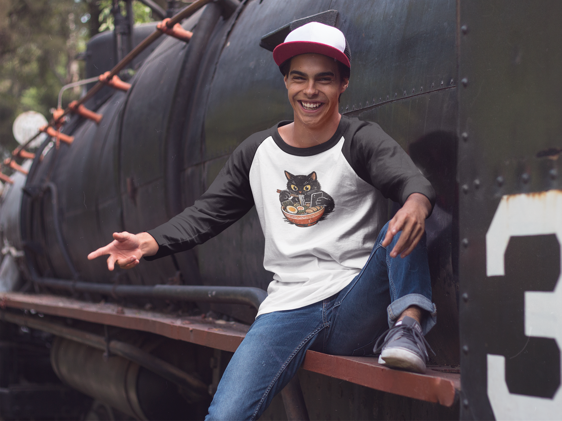 Level up your casual style with the ultimate comfort combo: Cats and Carbs. Featuring a vintage-inspired graphic of a determined feline tackling a bowl of ramen, this unisex raglan T-shirt is perfect for anyone who takes their snacks—and their chill time—seriously.